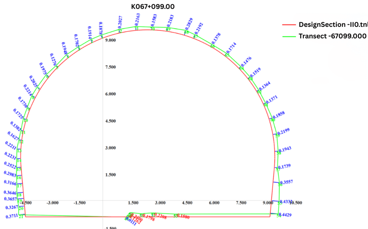 • Quantitative excavation statistics were derived by integrating sectional area differences along the tunnel chainage, producing over-break and under-break volumes for engineering evaluation.