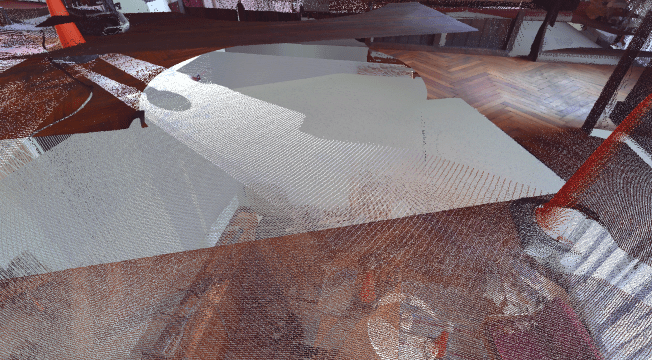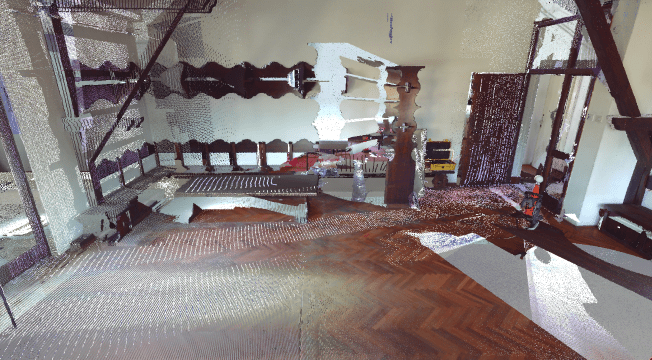 Tripod-based stations can leave gaps behind furniture and shelving where line-of-sight is limited. A continuous SLAM trajectory helps recover geometry in these partially occluded areas.