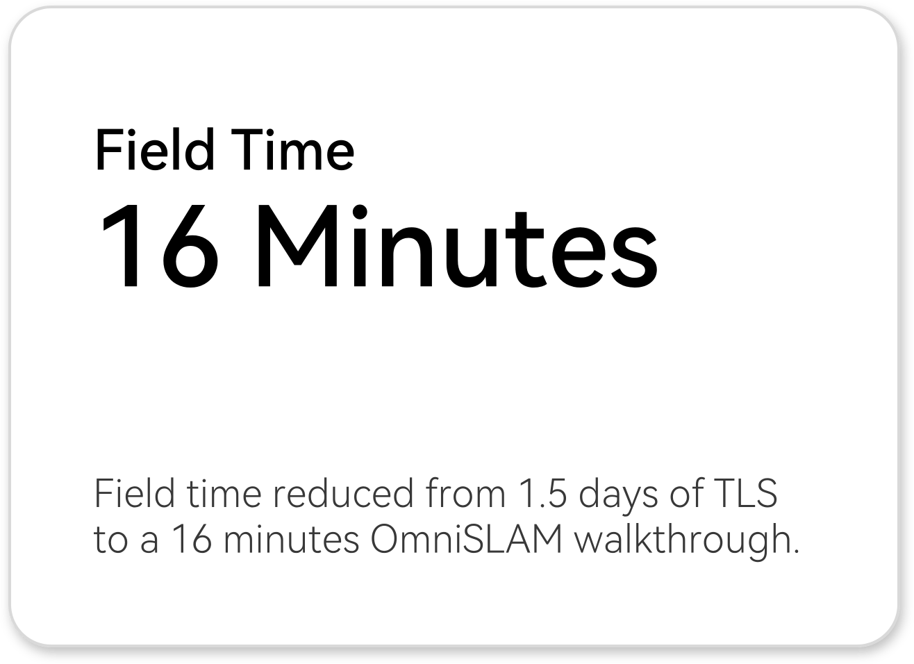 | Field capture | ~1.5 days of stop-start tripod scanning, many station setups | 16 minutes single continuous walkthrough for full interior coverage | Field capture time reduced from days to minutes, with minimal disruption to on-site activities. |
