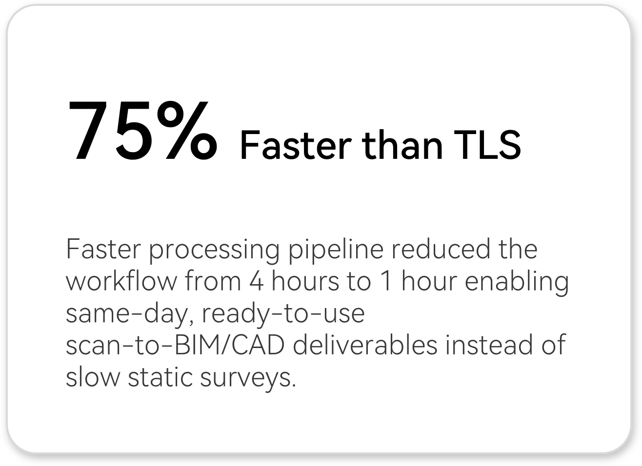 | Data post-processing | ~4 hours manual registration and alignment to control | ~1 hour trajectory optimisation and export | 75% less processing time before data is ready for BIM measurement. |