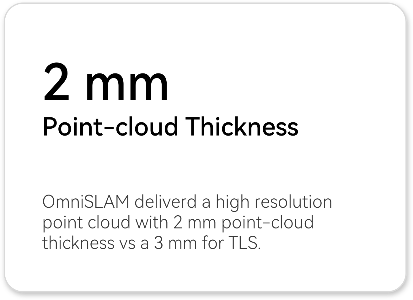 | Point-cloud thickness | Approx. 3 mm point-cloud thickness | Approx. 2 mm point-cloud thickness | ~33% tighter thickness, sharper geometry for measurement and modelling. |