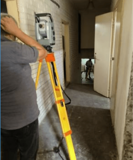 Using a tripod-mounted scanner, the team established a traditional network of control points and then progressed room by room. Walls, doors, stair cores, and furniture created frequent occlusions, so additional stations were introduced to fill in missing geometry. On a multi-storey structure with narrow corridors and service rooms, those additional setups quickly accumulated.