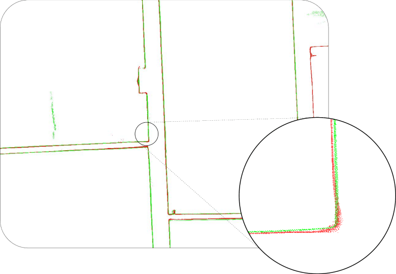 Visual comparisons at both local and global scales supported the numerical results. In the Point Cloud Registration View, the green line (TLS) and the red line (OmniSLAM R8+) lay neatly on top of each other across intersecting walls and corridors, with clean, sharp edges and no sign of drift over the length of the trajectory. The zoomed comparison at key building corners reinforced this finding, showing the two profiles closely overlapping with no discernible bias.