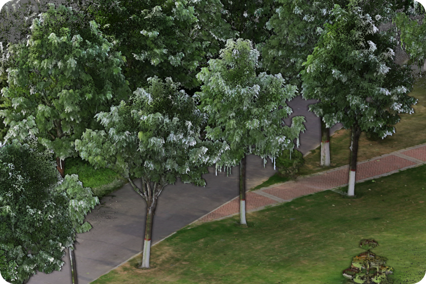 Since LiDAR cannot penetrate forests, the tree canopy point cloud obtained by the drone and the tree point cloud collected by the "R8+" are fused. The fused point clouds are completely aligned without misalignment or stratification, and finally complete and clear 3D forest data is acquired.